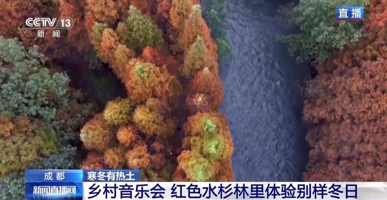 石羊镇“奇瑞河谷”椿芽岛营地内有2000多棵水杉树。秋末冬初,水杉变成红棕色,从空中俯瞰,就像一幅被大自然“调色”的山水画。